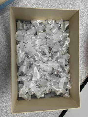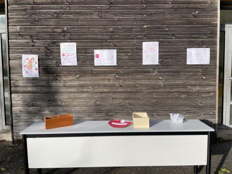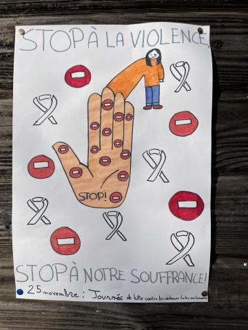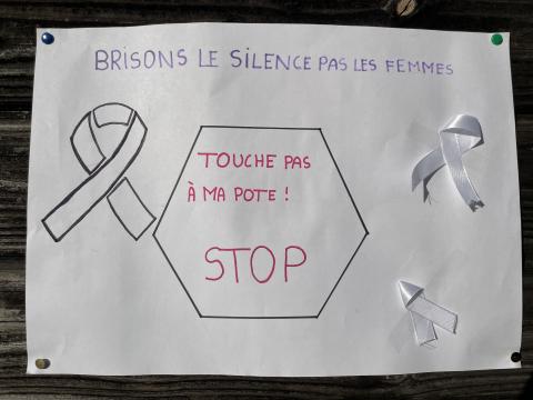 Des affiches dénonçant les violences faites aux femmes décoraient la cour, et les élèves du club ont distribué à tous et toutes des rubans blancs, symbole de la lutte contre les violences faites aux femmes.