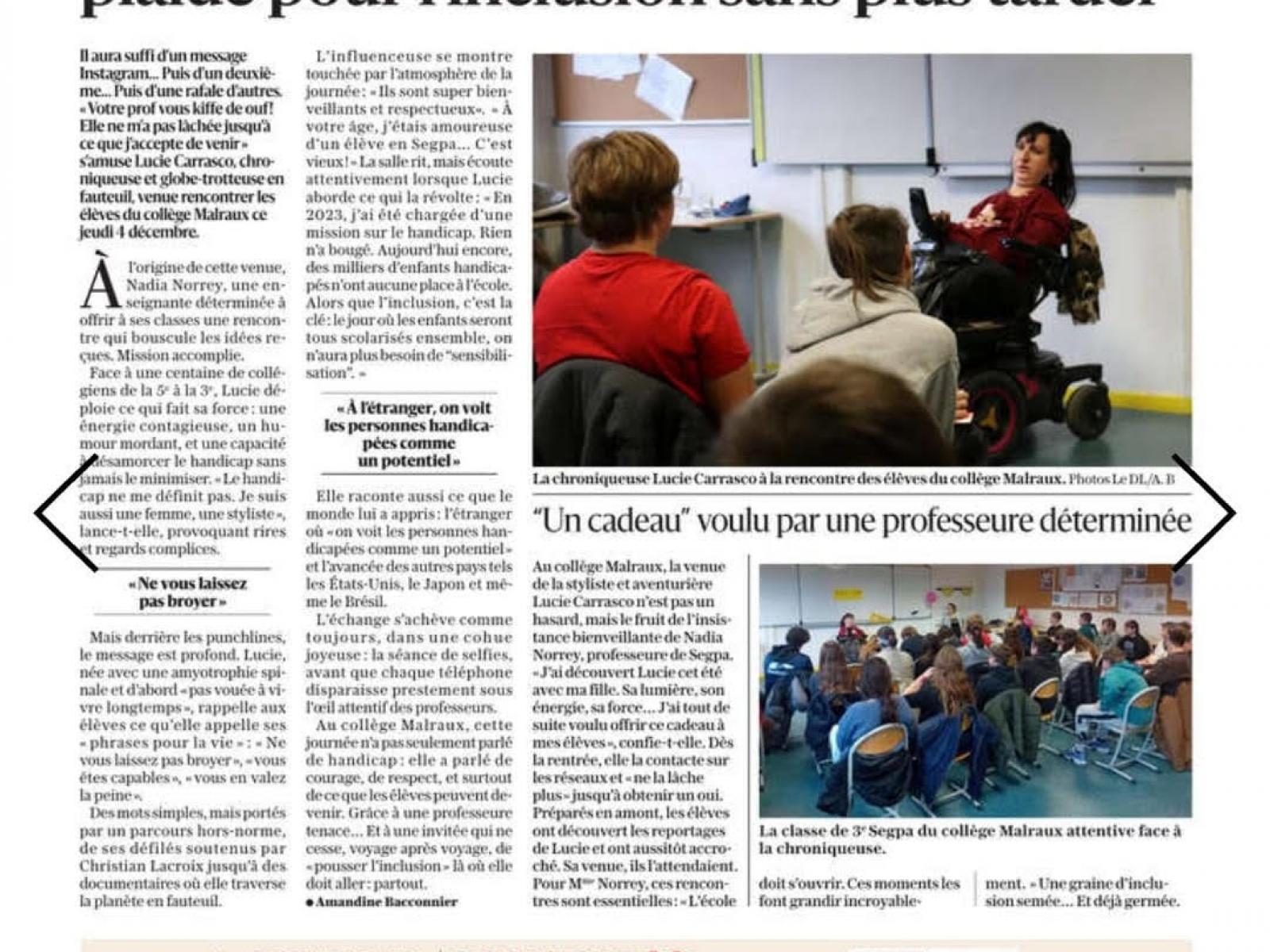 - Échange avec Lucie Carrasco, qui a réalisé des documentaires sur ses voyages autour du monde en fauteuil roulant.