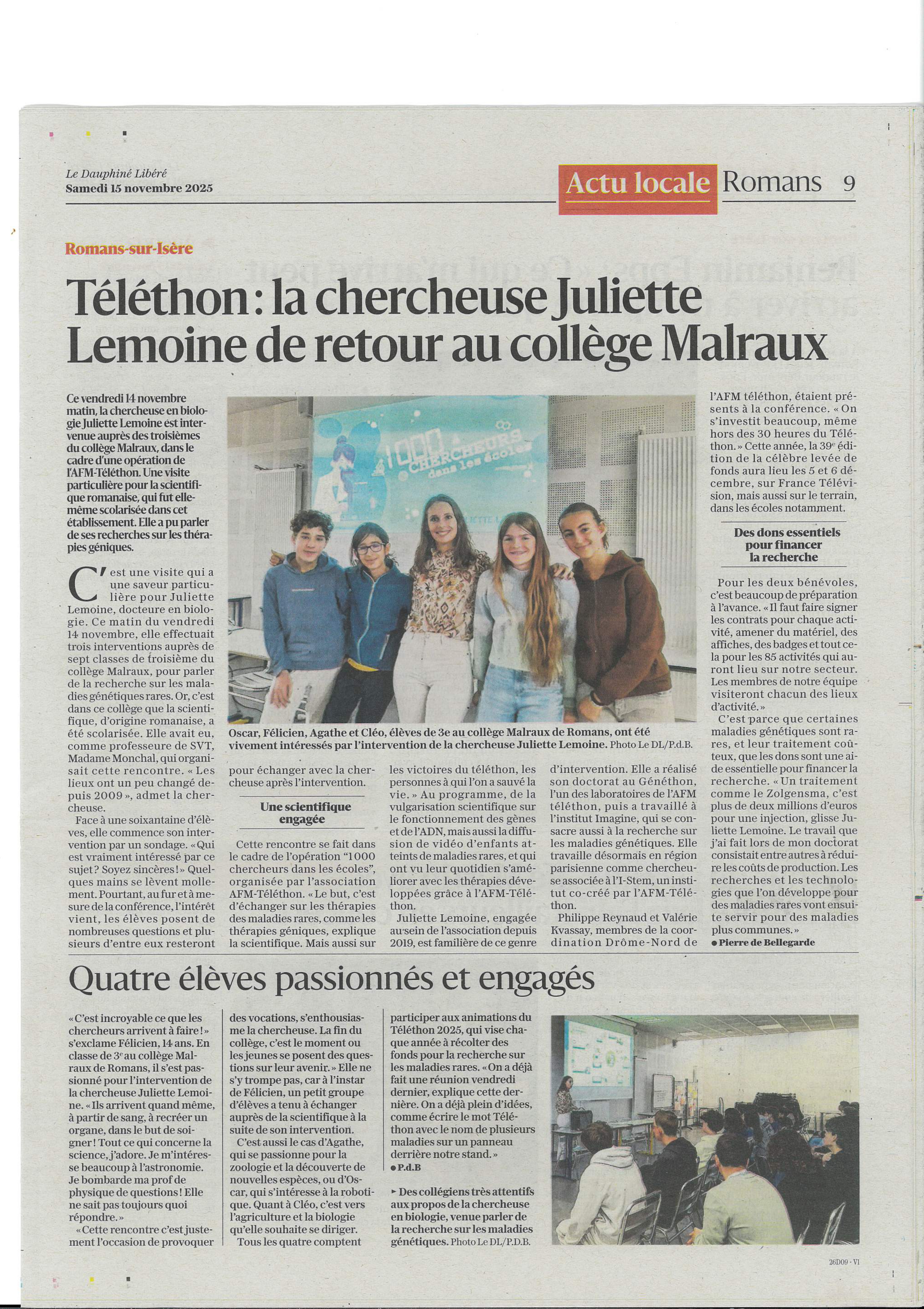 Vendredi 14 novembre, tous les élèves de 3ème ont participé à l’opération « 1000 chercheurs dans les écoles » en partenariat avec l’AFM Téléthon.